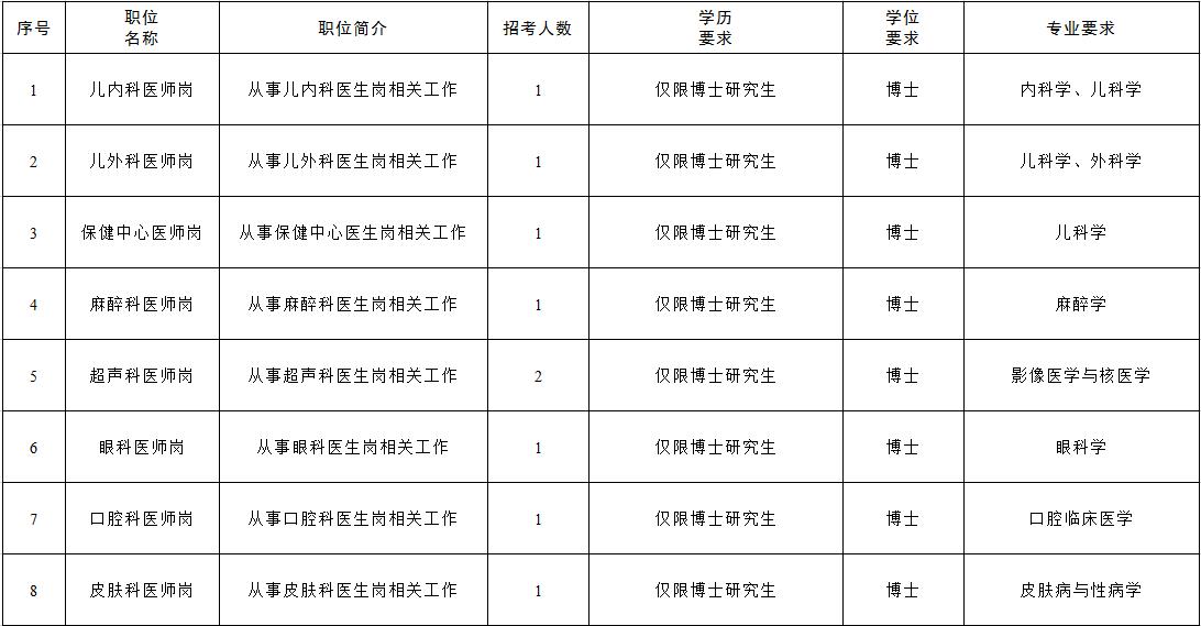 兒內(nèi)科醫(yī)師1名,兒外科醫(yī)師1名,保健中心醫(yī)師1名,麻醉科醫(yī)師1名,超聲科醫(yī)師2名,眼科醫(yī)師1名,口腔科醫(yī)師1名,皮膚科醫(yī)師1名