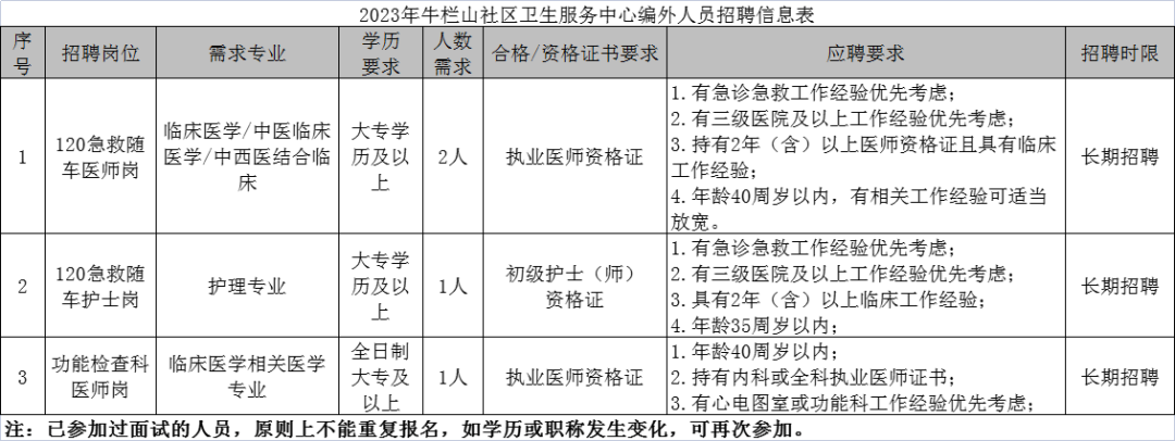 本次2023年編外合同制工作人員公開招聘共涉及3個(gè)招聘崗位,具體崗位見公告結(jié)尾附件:2023年順義區(qū)牛欄山社區(qū)衛(wèi)生服務(wù)中心編外人員招聘信息表。