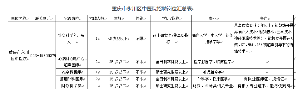 重慶市永川區(qū)中醫(yī)院招聘崗位匯總表及條件要求
