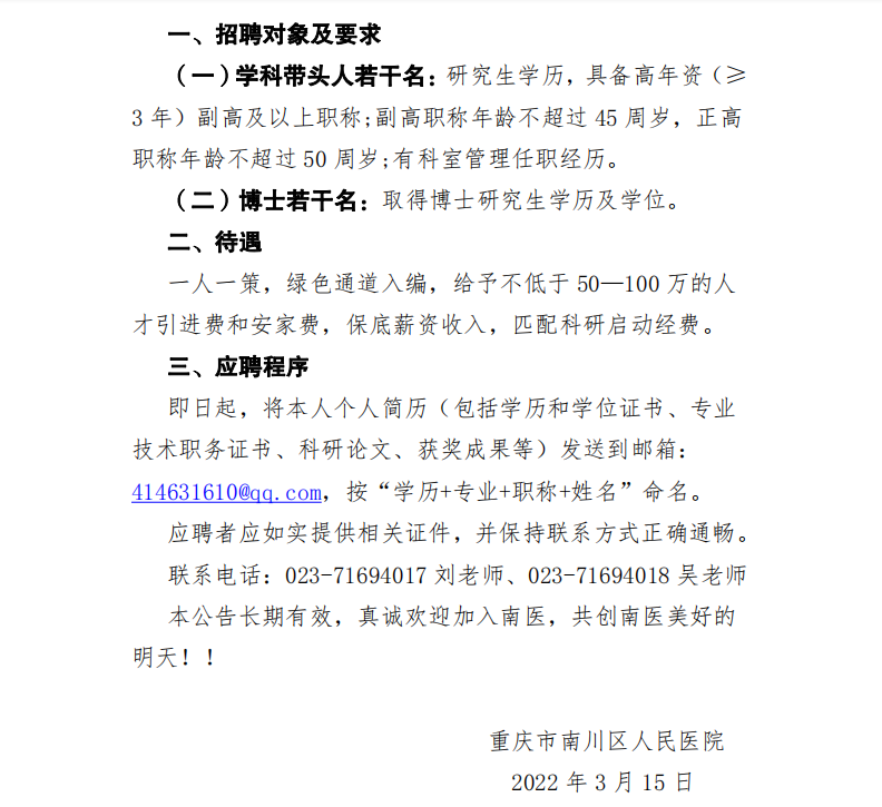 重慶市南川區(qū)人民醫(yī)院2022年招聘學(xué)科帶頭人、博士若干名