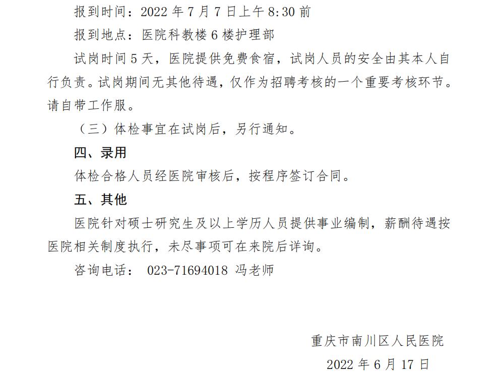 醫(yī)學(xué)教育網(wǎng)醫(yī)療衛(wèi)生招聘欄目每天都會(huì)更新全國(guó)各地新鮮招聘公告信息,致力于為廣大即將進(jìn)入醫(yī)療衛(wèi)生系統(tǒng)/醫(yī)院/醫(yī)療事業(yè)單位的工作人員進(jìn)行服務(wù),以上就是醫(yī)學(xué)教育網(wǎng)小編為大家整理的:重慶市南川區(qū)人民醫(yī)院2022年6月招聘工作人員53人,希望能夠幫助到大家。