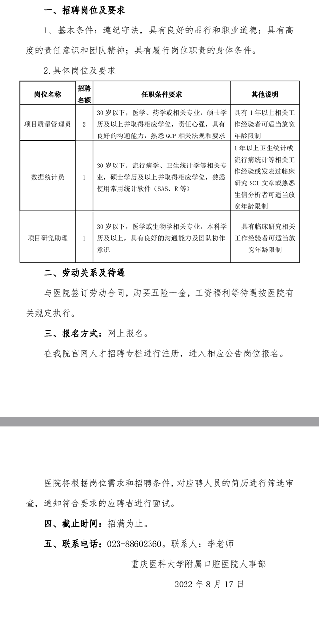 重慶醫(yī)科大學附屬口腔醫(yī)院招聘編外人員4名
