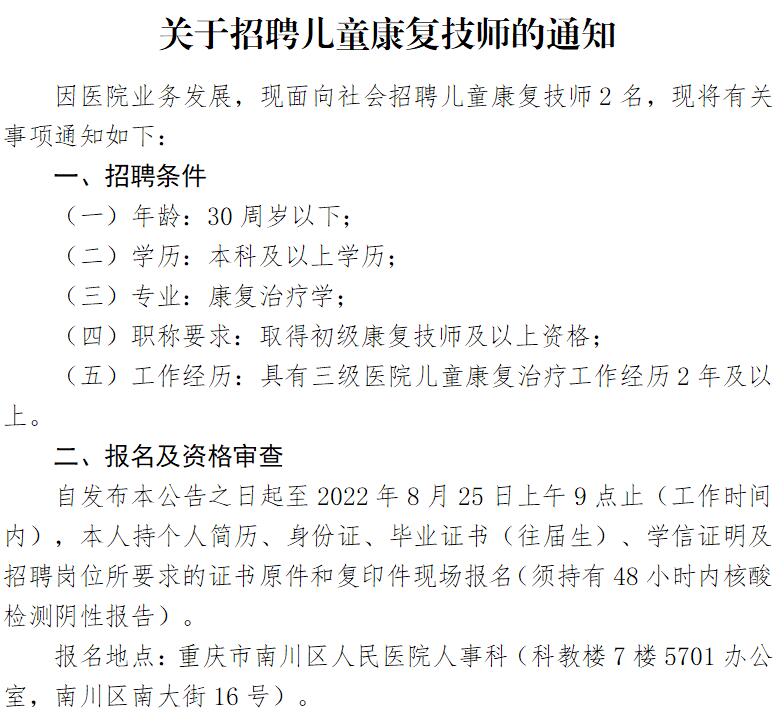 重慶市南川區(qū)人民醫(yī)院招聘兒童康復(fù)技師2名