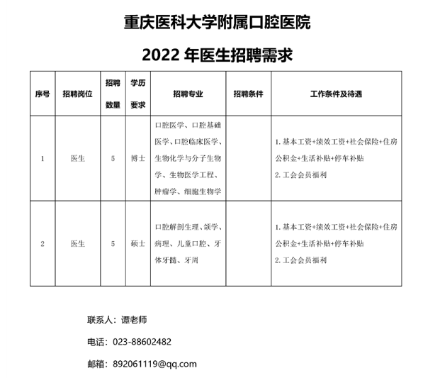 重慶醫(yī)科大學附屬口腔醫(yī)院2022年招聘醫(yī)生10人