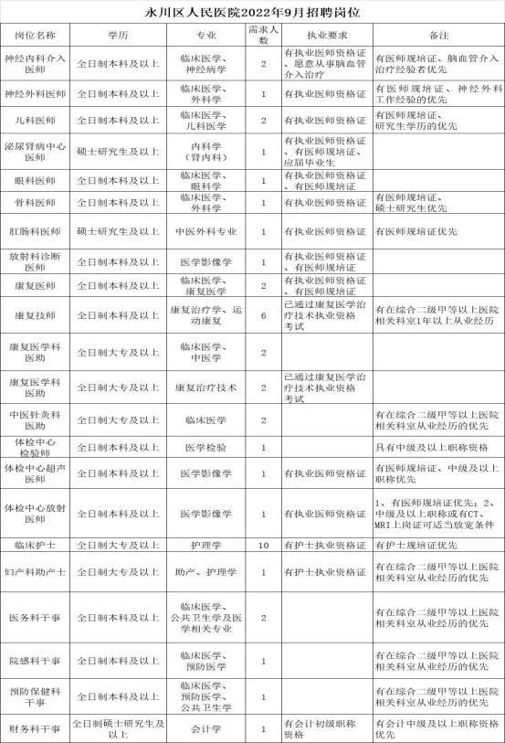重慶市永川區(qū)人民醫(yī)院2022年9月招聘工作人員43人