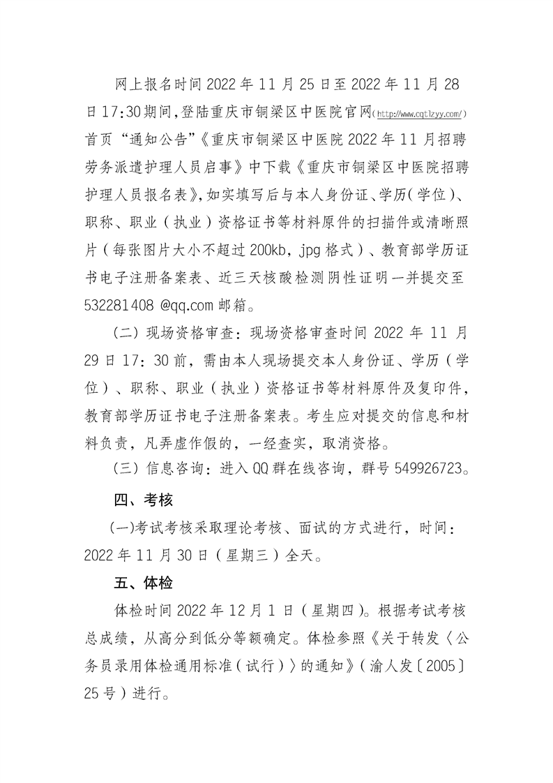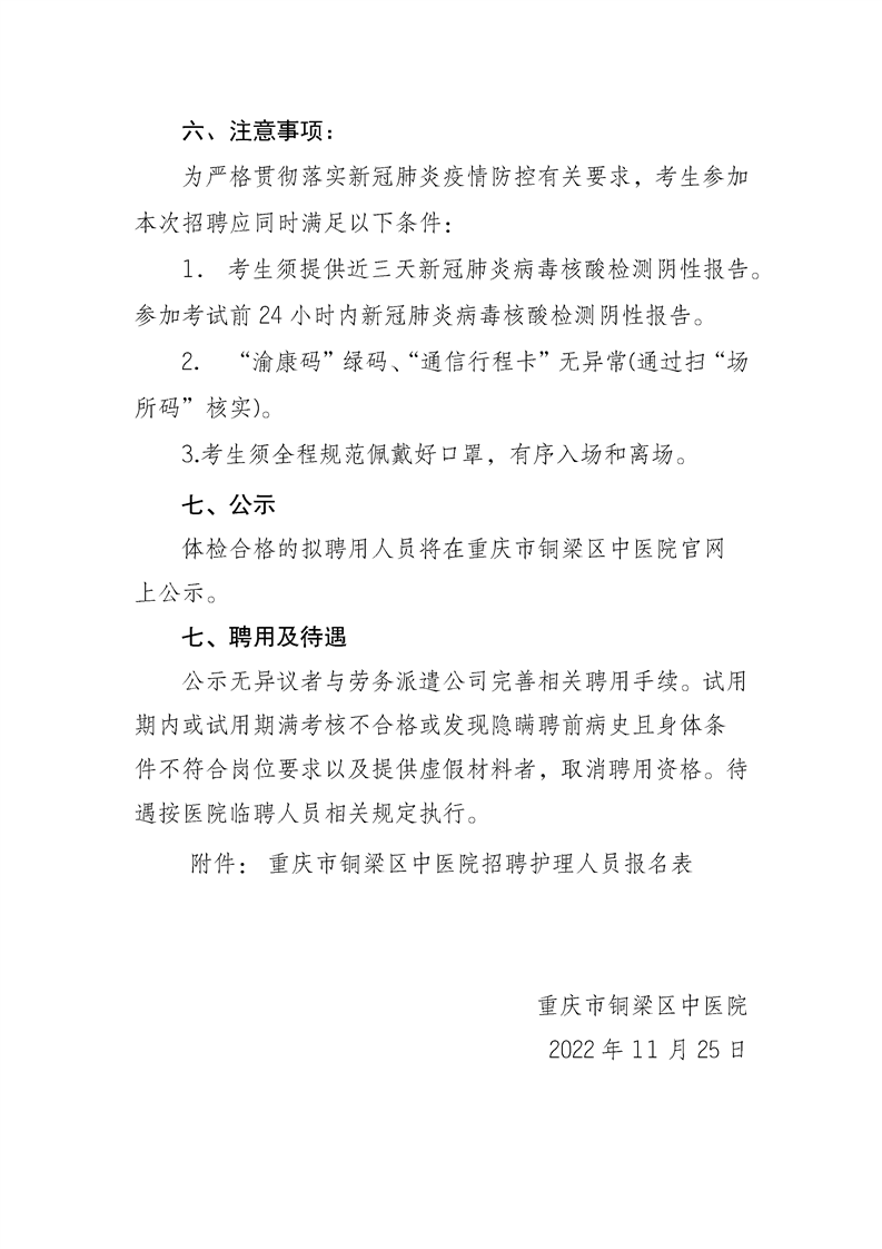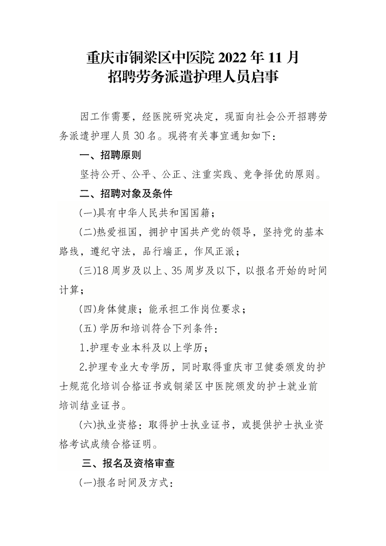 重慶市銅梁區(qū)中醫(yī)院2022年11月招聘勞務(wù)派遣護理人員30名