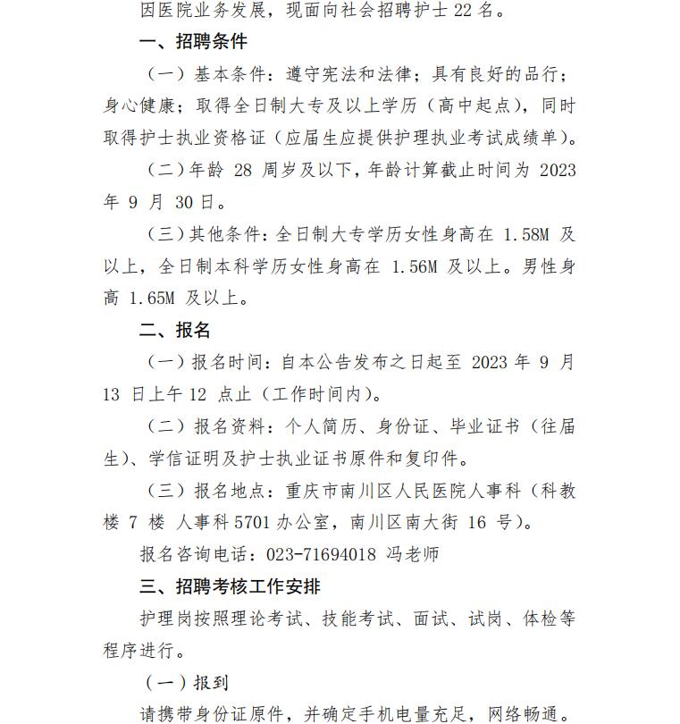 重慶市南川區(qū)人民醫(yī)院2023年9月招聘護士22名