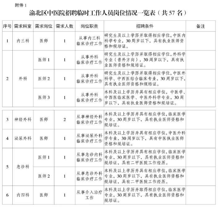 重慶市渝北區(qū)中醫(yī)院第四季度招聘臨時(shí)工作人員57名