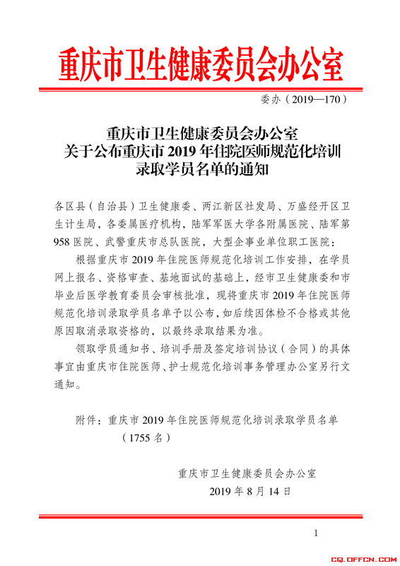 重慶衛(wèi)健委關(guān)于公布重慶市2019年住院醫(yī)師規(guī)范化培訓(xùn)錄取學(xué)員名單的通知