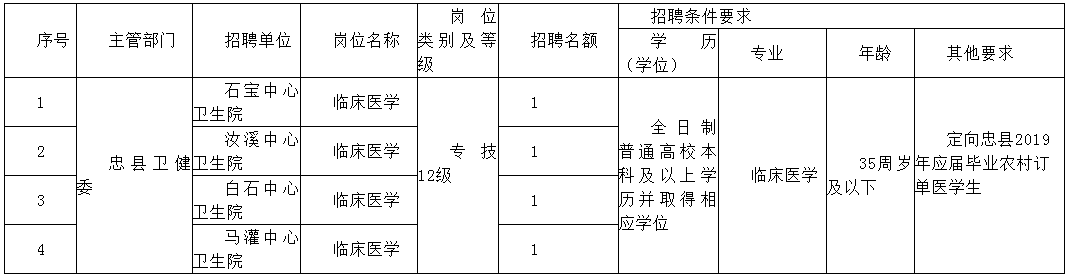 本次擬招聘人數(shù)共4名。招聘對象為2019年應屆畢業(yè)農村訂單醫(yī)學生定向忠縣4人。