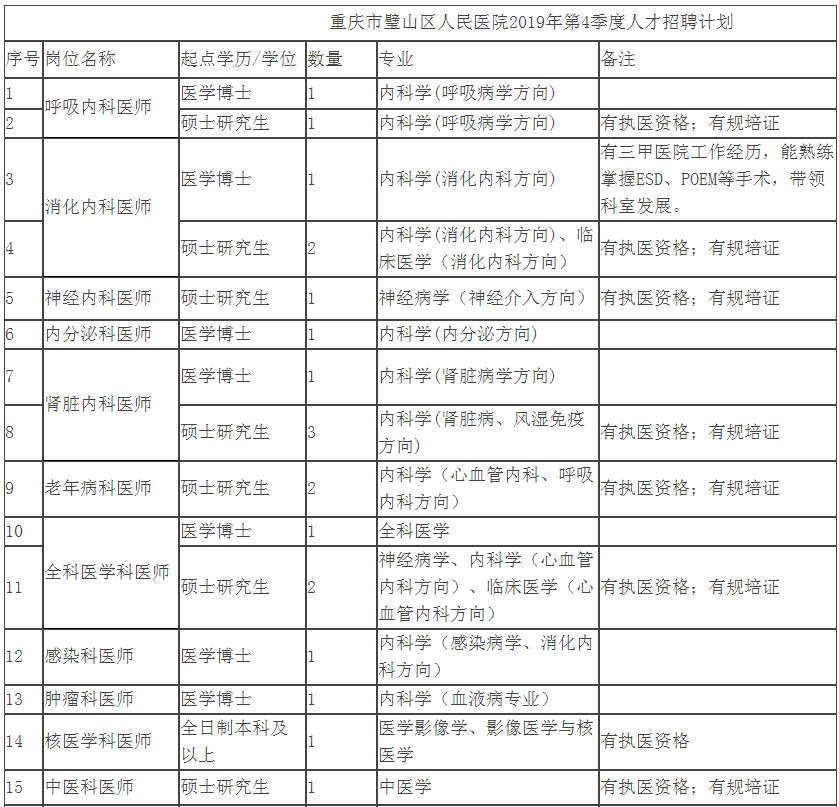以上就是小編為大家整理的2019年第四季度重慶璧山區(qū)人民醫(yī)院招聘醫(yī)療專業(yè)技術(shù)人才92人,還請(qǐng)大家多多關(guān)注醫(yī)學(xué)教育網(wǎng),我們會(huì)隨時(shí)更新更多更好的有關(guān)醫(yī)學(xué)知識(shí)、醫(yī)療招聘及考試輔導(dǎo)等相關(guān)信息。敬請(qǐng)期待!