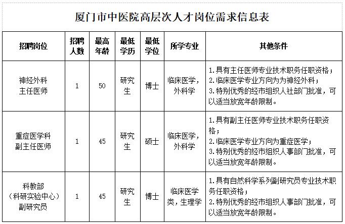 因醫(yī)院業(yè)務發(fā)展需要,我院擬招聘以下崗位工作人員,詳見《廈門市中醫(yī)院高層次人才崗位需求信息表》。有意者請將個人簡歷、學歷學位證書、專業(yè)資格證書及執(zhí)業(yè)證書以及有關業(yè)績的證明材料投遞至應聘郵箱,以附件形式發(fā)送,word或PDF格式為佳,郵件主題以“高層次報名+應聘崗位+姓名”命名。