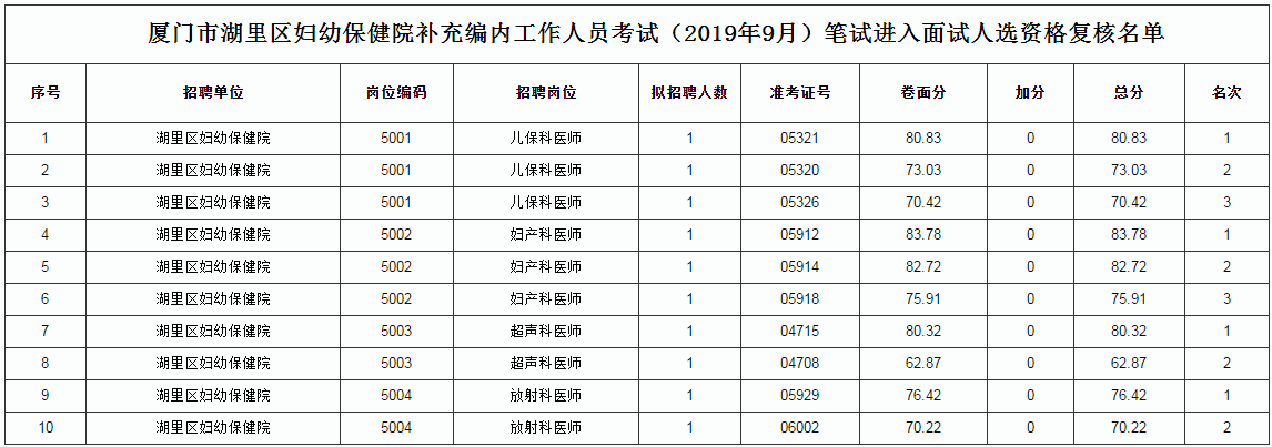 1.廈門市湖里區(qū)婦幼保健院補(bǔ)充編內(nèi)工作人員考試(2019年9月)筆試進(jìn)入面試人選資格復(fù)核名單