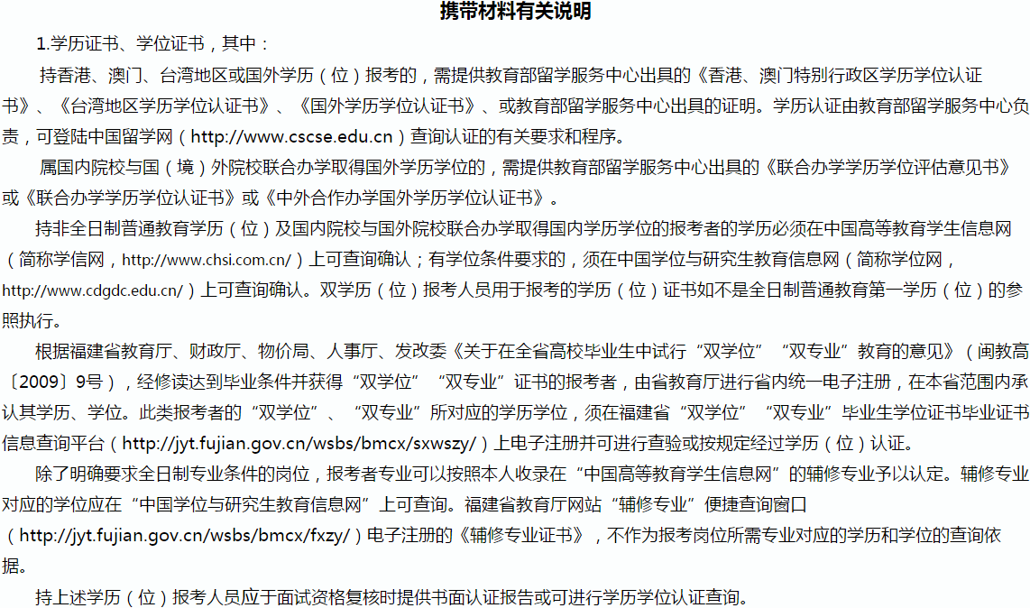 報(bào)名表、準(zhǔn)考證、身份證、個(gè)人簡歷、學(xué)歷(位)證(持香港、澳門、臺(tái)灣地區(qū)或國外學(xué)歷、學(xué)位和非全日制普通教育學(xué)歷、學(xué)位報(bào)考的,還須提供相關(guān)機(jī)構(gòu)書面認(rèn)證報(bào)告或可進(jìn)行學(xué)歷學(xué)位認(rèn)證查詢,未及時(shí)提供的,應(yīng)作書面承諾,格式見附件2),以及崗位資格條件要求的其他材料。