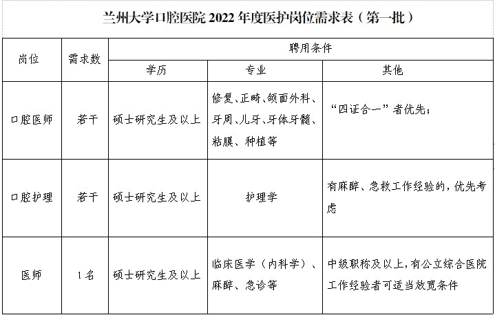 蘭州大學(xué)口腔醫(yī)院2022年招聘醫(yī)護(hù)人員若干名