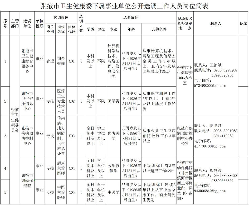 張掖市衛(wèi)生健康委下屬4個事業(yè)單位5個崗位公開選調(diào)5名工作人員,選調(diào)計劃詳見《張掖市衛(wèi)生健康委下屬事業(yè)單位公開選調(diào)工作人員崗位簡表》(附件1,以下簡稱《崗位簡表》)。