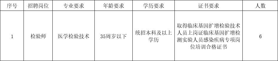 身體健康,五官端正,精神飽滿,遵紀(jì)守法,熱愛衛(wèi)生事業(yè),恪守職業(yè)道德,具有較強(qiáng)團(tuán)隊(duì)協(xié)作精神,學(xué)歷要求國家統(tǒng)招全日制本科及以上,需具有臨床基因擴(kuò)增檢測(cè)實(shí)驗(yàn)人員感染疾病專項(xiàng)崗位培訓(xùn)合格證。