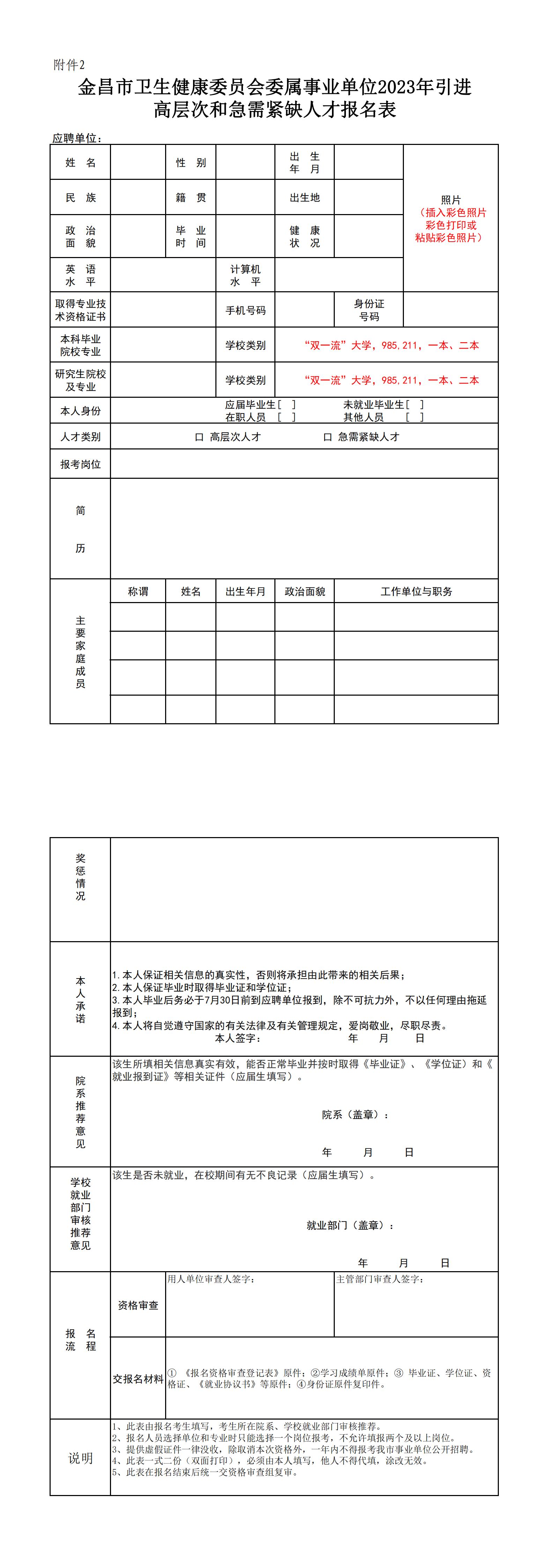 (一)報(bào)名。采取網(wǎng)上報(bào)名和現(xiàn)場報(bào)名相結(jié)合的方式,應(yīng)聘人員認(rèn)真閱讀《2023年金昌市衛(wèi)生健康系統(tǒng)事業(yè)單位引進(jìn)高層次和急需緊缺人才公告》,填寫《金昌市衛(wèi)生健康委員會(huì)委屬事業(yè)單位2023年引進(jìn)高層次和急需緊缺人才報(bào)名表》進(jìn)行報(bào)名。網(wǎng)上報(bào)名的應(yīng)聘人員,將身份證、報(bào)名表、個(gè)人簡歷、畢業(yè)證(含教育部學(xué)籍在線驗(yàn)證的學(xué)歷報(bào)告)、學(xué)位證、研究生提供本科畢業(yè)證書原件,相關(guān)資格證執(zhí)業(yè)證、學(xué)習(xí)成績單原件(需蓋章)、就業(yè)協(xié)議書原件、就業(yè)報(bào)到證等報(bào)名所需的相關(guān)材料電子版(PDF格式)壓縮文件包(備注姓名+畢業(yè)院校+專業(yè)+應(yīng)聘崗位)發(fā)送至報(bào)名郵箱jcswjw8211529@163.com 。2023年應(yīng)屆生須提供畢業(yè)生就業(yè)推薦表、學(xué)業(yè)課程成績單、就業(yè)協(xié)議書及其他所需材料?,F(xiàn)場報(bào)名的應(yīng)聘人員到指定地點(diǎn)報(bào)名。每位應(yīng)聘者只允許選擇填報(bào)1個(gè)崗位,具體各崗位引進(jìn)條件以崗位需求表相關(guān)要求為準(zhǔn)。應(yīng)聘人員要對(duì)其所提供材料的真實(shí)性負(fù)責(zé),如有弄虛作假,取消其應(yīng)聘資格。