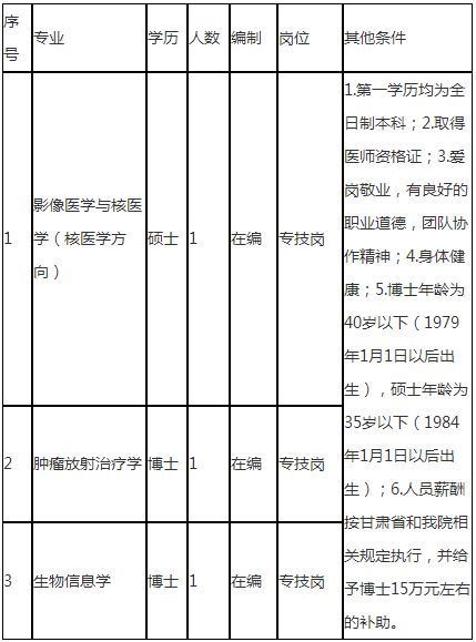 甘肅省腫瘤醫(yī)院、甘肅省醫(yī)學(xué)科學(xué)研究院引進(jìn)編制內(nèi)高層次醫(yī)學(xué)專(zhuān)業(yè)人才