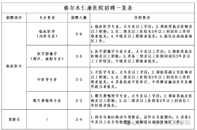 本次招聘面向社會公開進行,具體崗位及要求詳見《格爾木仁康醫(yī)院招聘崗位一覽表》