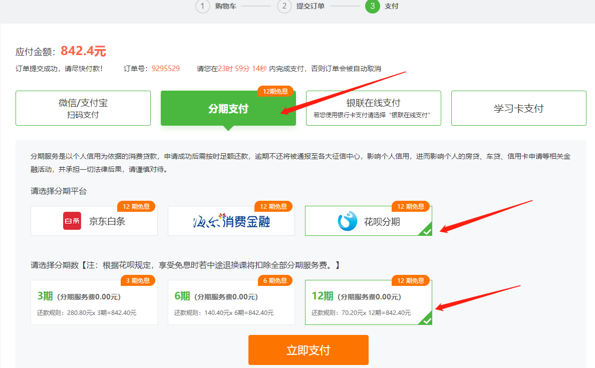 在支付頁(yè)面選擇“分期支付”——選擇分期平臺(tái)“京東白條/海爾消費(fèi)金融/花唄分期”——選擇分期數(shù)“3期/6期/12期”: