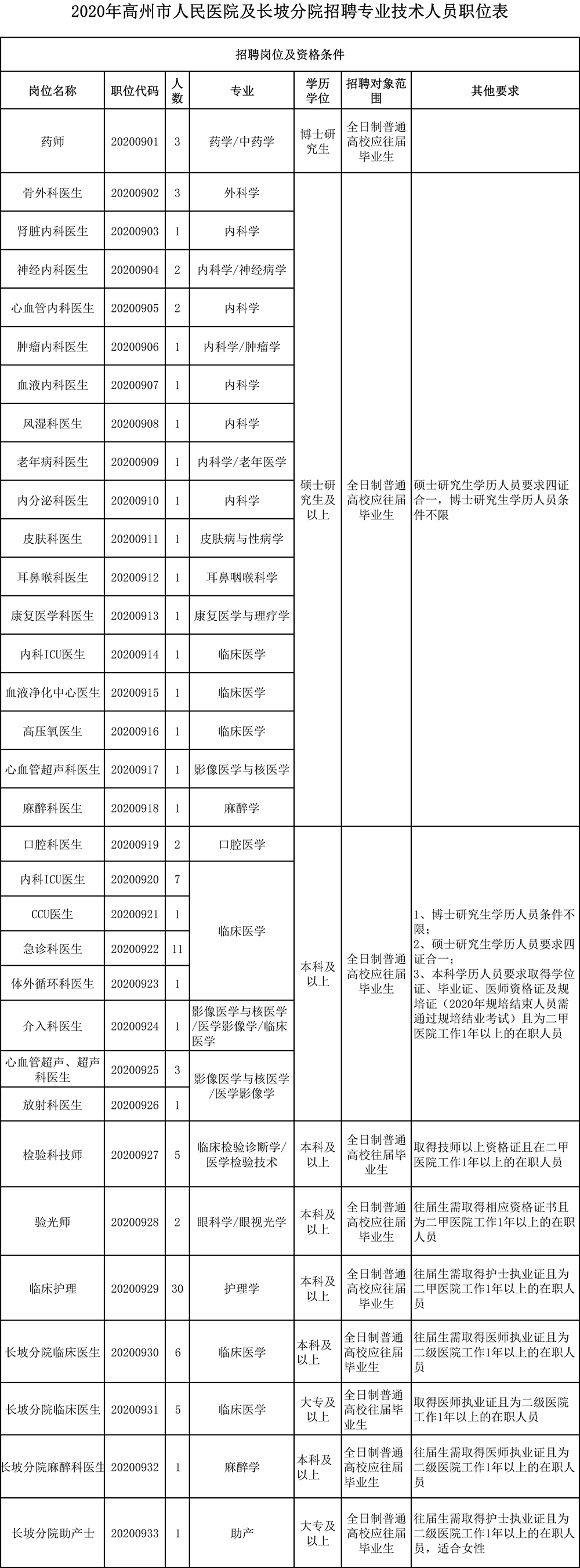 以上就是“2020年9月份廣東高州市人民醫(yī)院招聘101名衛(wèi)生類工作人員崗位計劃表”的通知內容。