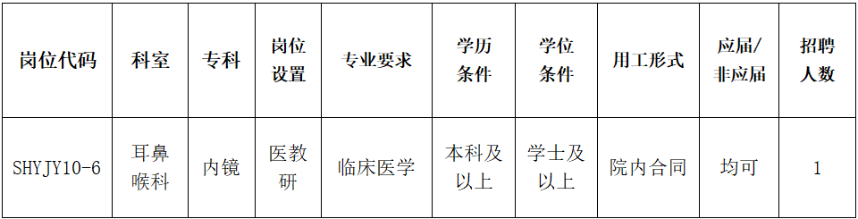 很多即將步入醫(yī)療崗位的朋友們都非常關(guān)注所在地區(qū)醫(yī)療崗位的招聘公告信息,醫(yī)學(xué)教育網(wǎng)醫(yī)療衛(wèi)生招聘欄目為了更好的服務(wù)正在找工作的醫(yī)療相關(guān)專業(yè)人員,每天為大家整理搜集新鮮的各地醫(yī)療衛(wèi)生系統(tǒng)/醫(yī)院等招聘公告通知和信息,歡迎大家查看!以下是公告通知:中山大學(xué)孫逸仙紀(jì)念醫(yī)院深汕中心醫(yī)院耳鼻喉科招聘1人,內(nèi)容如下: