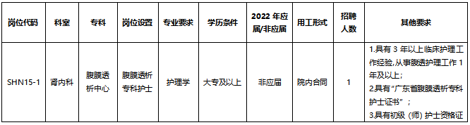 中山大學(xué)孫逸仙紀(jì)念醫(yī)院深汕中心醫(yī)院招聘腎內(nèi)科腹透專科護(hù)士1名