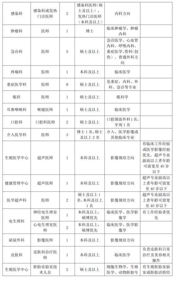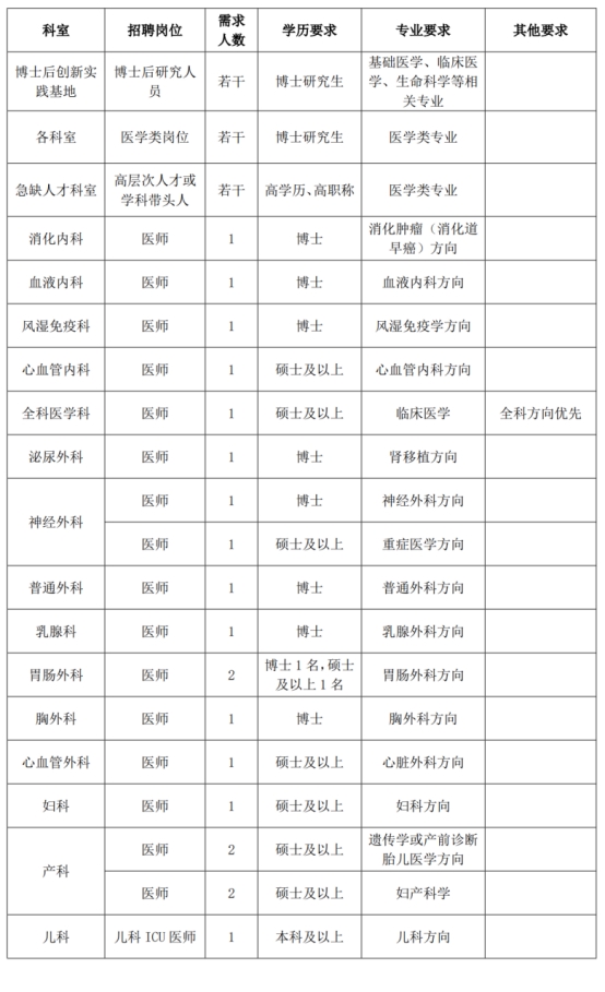 碩士研究生 | 各類(lèi)崗位 | 近三年內(nèi)(2020-2022)畢業(yè),或在三級(jí)醫(yī)院工作至今未中斷。醫(yī)生要求已完成規(guī)培。35歲及以下(1987年1月1日后出生)。 |