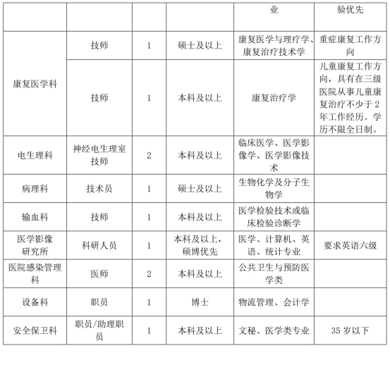 技師 | 2022年應(yīng)屆畢業(yè)生,或在三級(jí)醫(yī)院工作至今未中斷,或勞務(wù)派遣在我院工作至今未中斷。30歲及以下(1992年1月1日后出生)。 | |