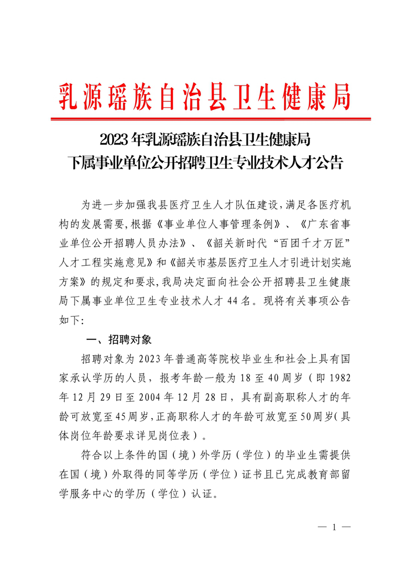韶關(guān)市乳源瑤族自治縣衛(wèi)生健康局下屬事業(yè)單位招聘衛(wèi)生專業(yè)技術(shù)人才44人