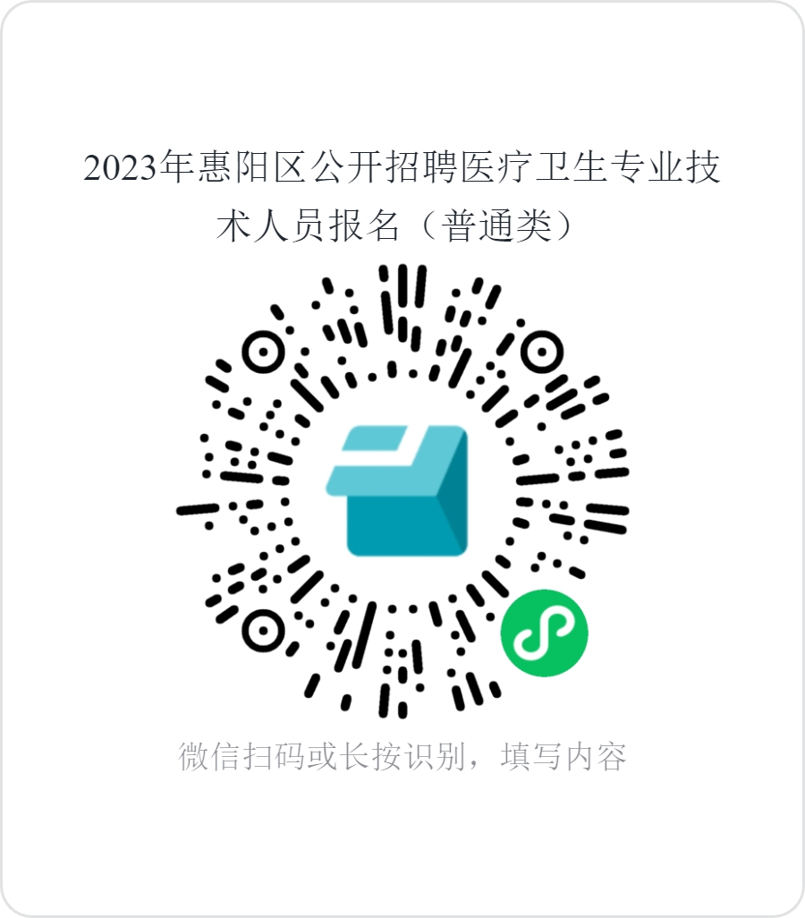 2.報(bào)名方式:采用微信小程序報(bào)名,不接受現(xiàn)場(chǎng)報(bào)名。考生掃描二維碼進(jìn)入“2023年惠陽區(qū)公開招聘醫(yī)療衛(wèi)生專業(yè)技術(shù)人員報(bào)名(高級(jí)職稱類)”,按要求認(rèn)真準(zhǔn)確填寫相關(guān)信息和上傳相關(guān)報(bào)名材料。