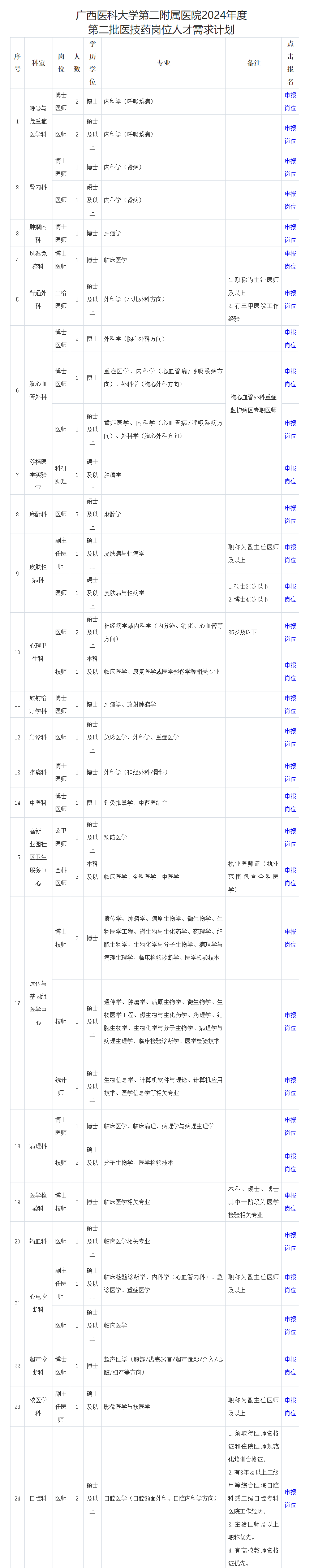 (一)詳見附件1《廣西醫(yī)科大學(xué)第二附屬醫(yī)院2024年度第二批醫(yī)技藥崗位人才需求計劃》。