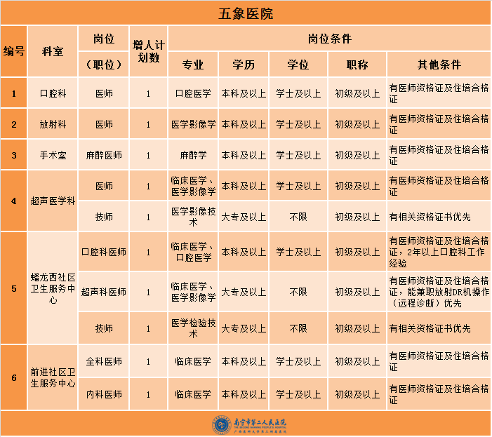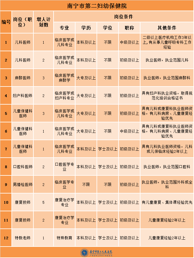 醫(yī)學(xué)教育網(wǎng)醫(yī)療衛(wèi)生招聘欄目每天都會(huì)更新全國(guó)各地新鮮招聘公告信息,致力于為廣大即將進(jìn)入醫(yī)療衛(wèi)生系統(tǒng)/醫(yī)院/醫(yī)療事業(yè)單位的工作人員進(jìn)行服務(wù),以上就是醫(yī)學(xué)教育網(wǎng)小編為大家整理的:南寧市第二人民醫(yī)院2022年招聘119人,希望能夠幫助到大家。