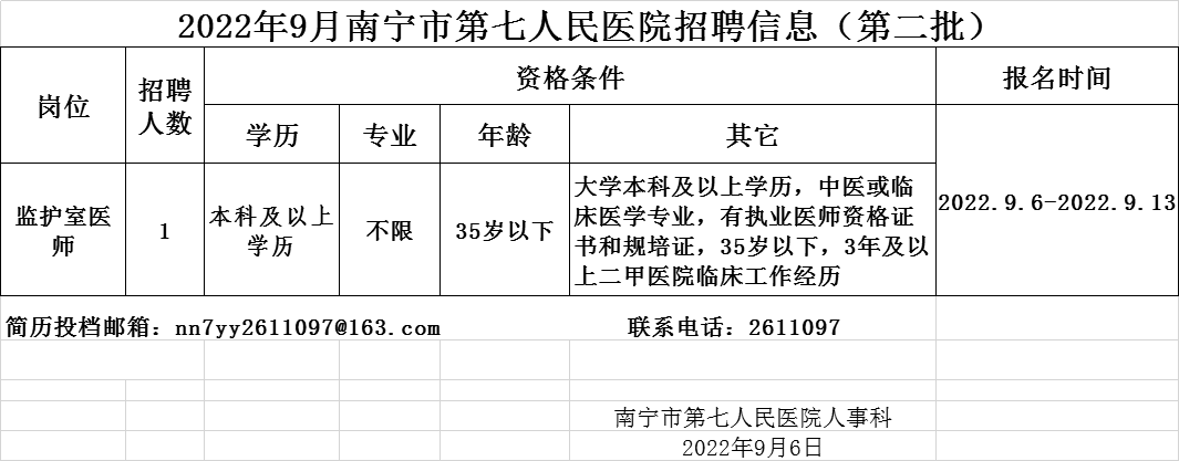 您是即將步入醫(yī)療行業(yè)的相關從業(yè)者嗎?您還在為在哪里能夠看到醫(yī)療崗位招聘信息而煩惱嗎?您還在擔心看不到所在地區(qū)全面的醫(yī)療招聘公告信息嗎?小編告訴您一個好消息,醫(yī)學教育網為了服務廣大醫(yī)學崗位人員,每天特意整理搜集全國各地醫(yī)療招聘公告信息,以下就是新鮮的公告通知:南寧市第七人民醫(yī)院2022年9月招聘監(jiān)護室醫(yī)師1名,歡迎查看。