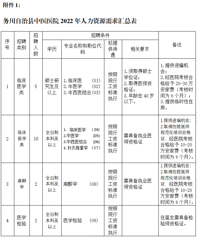 此次公開招聘專業(yè)技術工作人員共19名,具體招聘職位、職位代碼、招聘人數(shù)及相關要求詳見《務川自治縣中醫(yī)醫(yī)院2022年人力資源需求匯總表》(附件1,以下簡稱《崗位表》)。