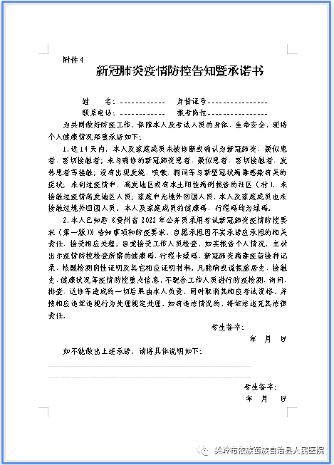 凡參加關(guān)嶺自治縣人民醫(yī)院2022年公開(kāi)招聘合同制人員的考生,須填寫(xiě)個(gè)人防疫情況申報(bào)表(附件3)和新冠肺炎疫情防控告知暨承諾書(shū)(附件4)。