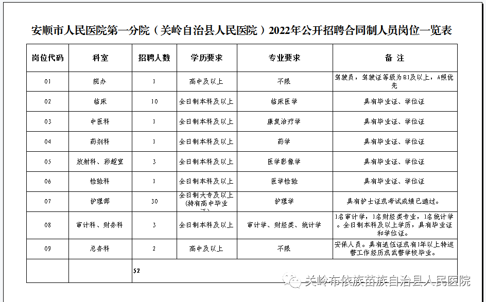 安順市人民醫(yī)院第一分院(關(guān)嶺自治縣人民醫(yī)院)招聘合同制人員52人