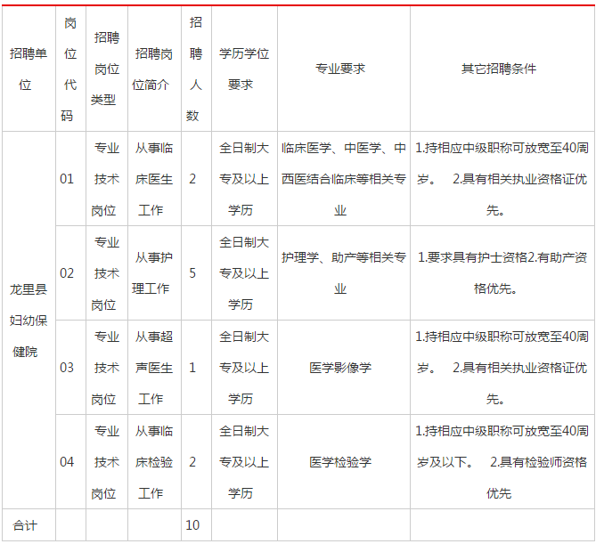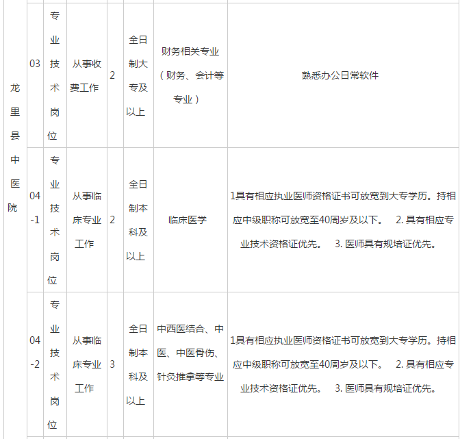隨著龍里縣經(jīng)濟(jì)社會的快速發(fā)展,外來人口不斷涌入,就診人數(shù)迅速增加,醫(yī)務(wù)人員緊缺的問題日益突出,為解決我縣醫(yī)務(wù)人員緊缺的問題,進(jìn)一步加強龍里縣醫(yī)療隊伍建設(shè),滿足轄區(qū)內(nèi)群眾看病難問題,特此面向社會公開招聘臨聘醫(yī)務(wù)人員。