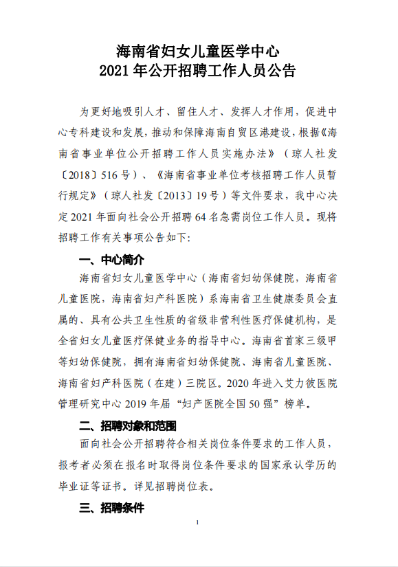 招聘64人!海南省婦女兒童醫(yī)學(xué)中心2021年公開招聘工作人員公告