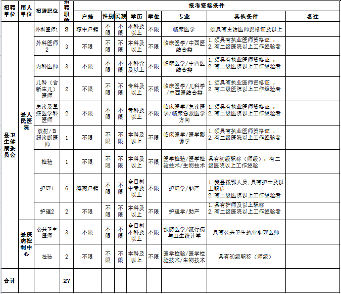 瓊中縣衛(wèi)生健康委員會(huì)所屬事業(yè)單位緊急補(bǔ)充醫(yī)療專業(yè)技術(shù)人員招聘崗位一覽表(27人)