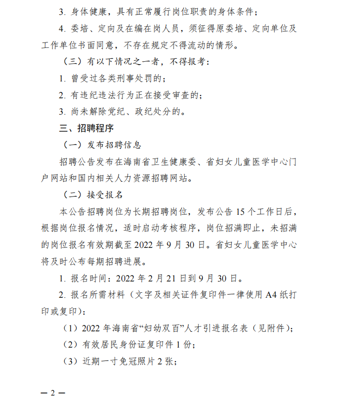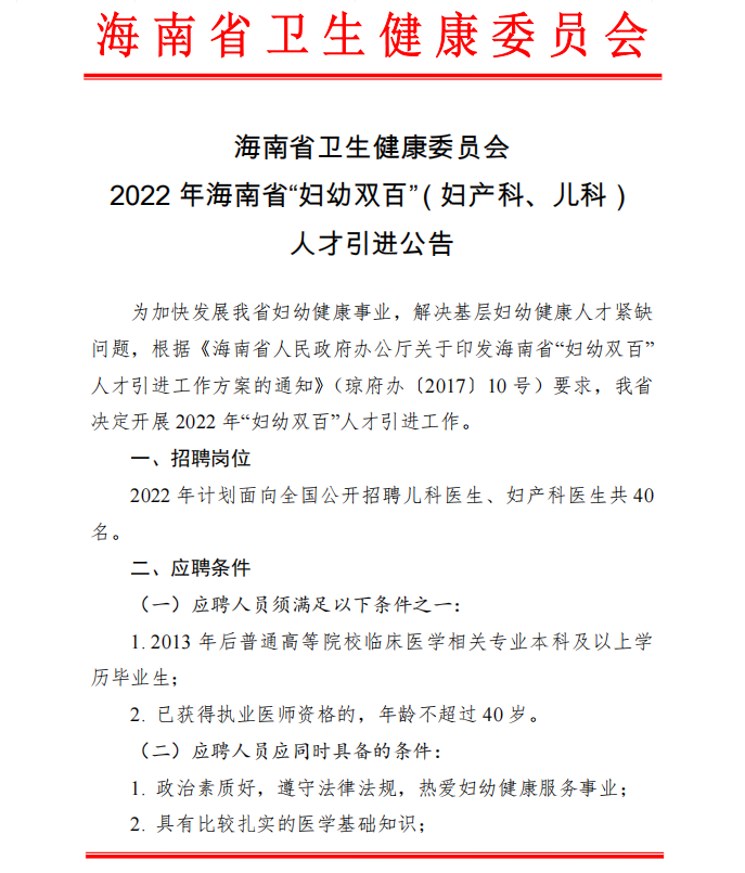 2022年海南省“婦幼雙百”人才引進(jìn)兒科醫(yī)生、婦產(chǎn)科醫(yī)生40名