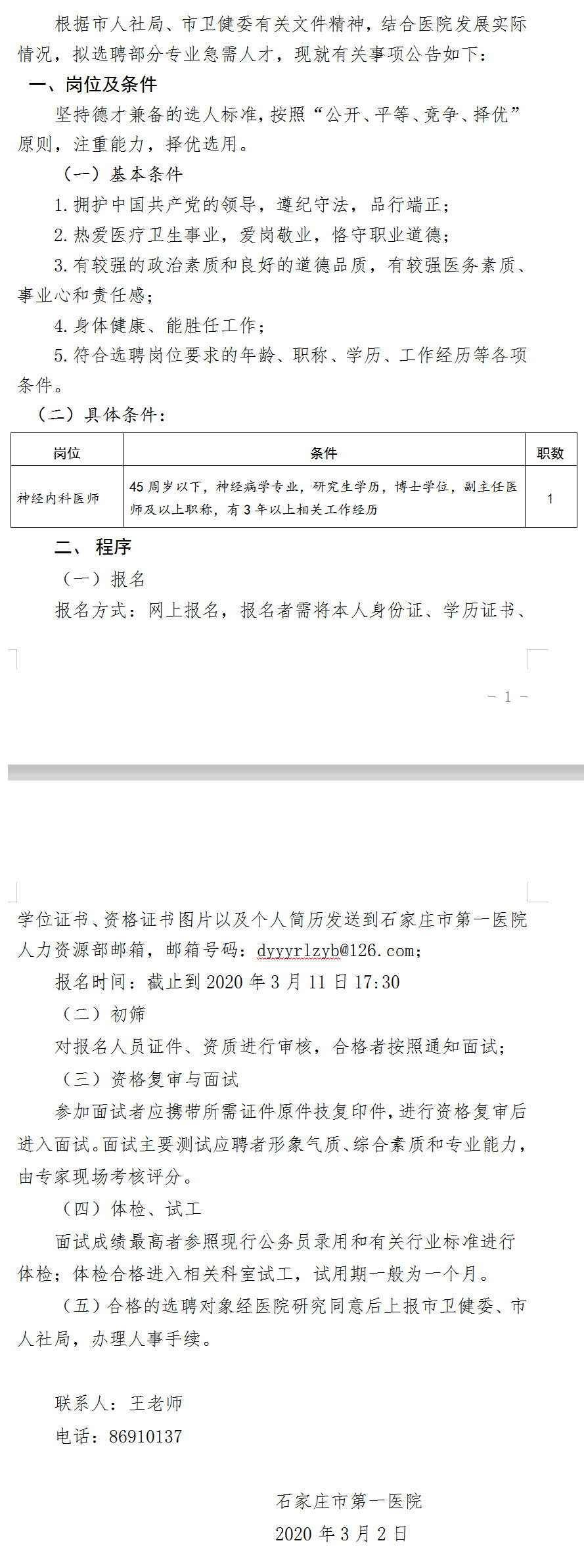 【醫(yī)療招聘】2020石家莊市第一醫(yī)院關(guān)于選聘急需人才的公告