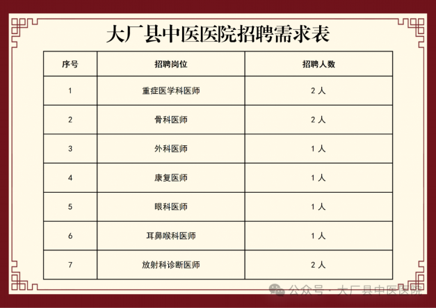 醫(yī)療招聘進(jìn)行時(shí)!各地紛紛發(fā)布醫(yī)療招聘公告,廣納賢才,醫(yī)學(xué)教育網(wǎng)為了更好的服務(wù)有就業(yè)意愿的相關(guān)醫(yī)療人員,將會(huì)為大家整理并更新各地醫(yī)療招聘的相關(guān)公告,大家可持續(xù)關(guān)注!以下是公告“2025年河北廊坊大廠縣中醫(yī)醫(yī)院公開(kāi)招聘醫(yī)師10人公告”的相關(guān)內(nèi)容:
