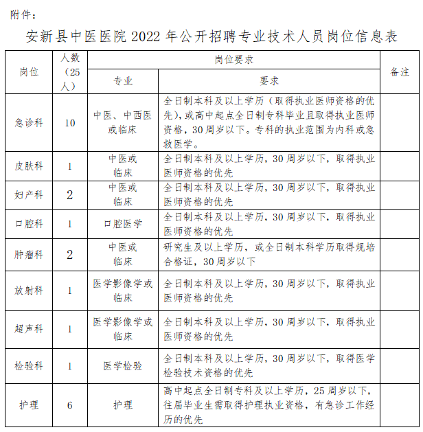 (一)本次共招聘衛(wèi)生專業(yè)技術(shù)人員25名,具體招聘崗位及名額詳見附件《安新縣中醫(yī)醫(yī)院2022年公開招聘專業(yè)技術(shù)人員崗位信息表》。