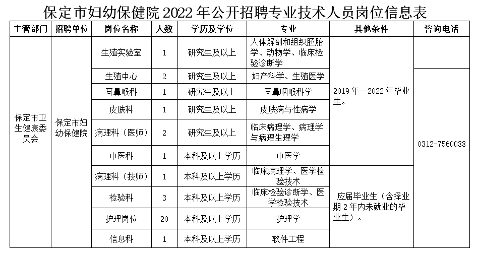 二、招聘崗位、專(zhuān)業(yè)、名額及所需具體條件見(jiàn)《保定市婦幼保健院公開(kāi)招聘專(zhuān)業(yè)技術(shù)人員崗位信息表》