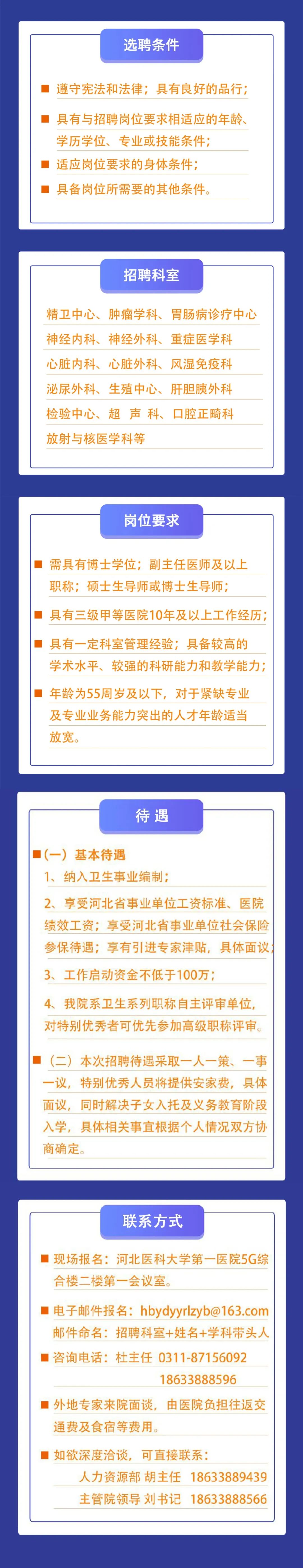很多即將步入醫(yī)療崗位的朋友們都非常關注所在地區(qū)醫(yī)療崗位的招聘公告信息,醫(yī)學教育網醫(yī)療衛(wèi)生招聘欄目為了更好的服務正在找工作的醫(yī)療相關專業(yè)人員,每天為大家整理搜集新鮮的各地醫(yī)療衛(wèi)生系統(tǒng)/醫(yī)院等招聘公告通知和信息,歡迎大家查看!以下是公告通知:河北醫(yī)科大學第一醫(yī)院學科帶頭人(后備學科帶頭人)招聘公告 ,內容如下: