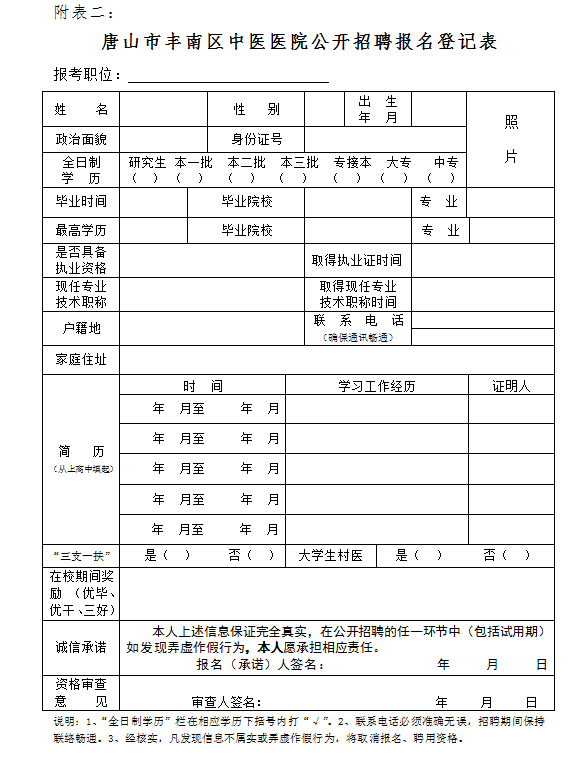 附表二、唐山市豐南區(qū)中醫(yī)醫(yī)院公開招聘報(bào)名登記表