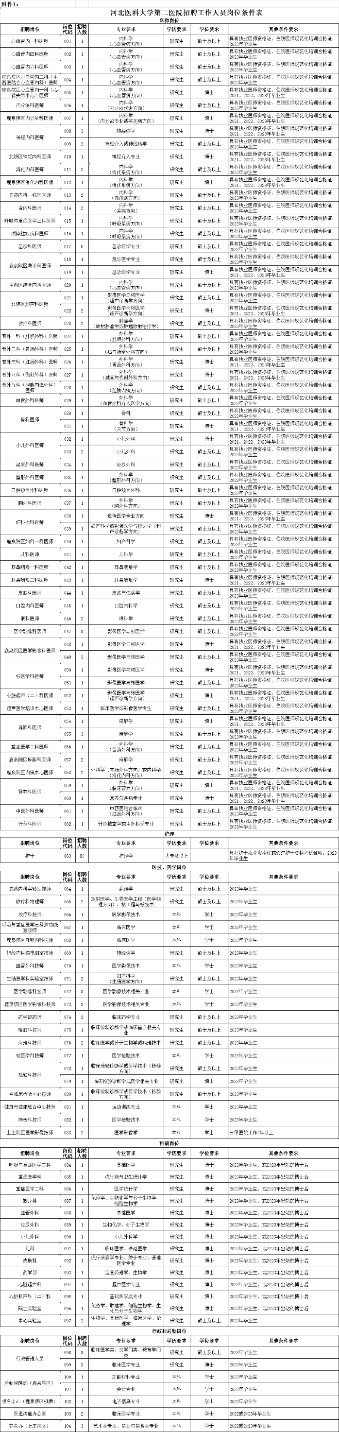 河北醫(yī)科大學(xué)第二醫(yī)院擬公開(kāi)招聘醫(yī)、護(hù)、藥技、科研和行政后勤崗位工作人員222名,各崗位具體招聘人數(shù)和崗位要求詳見(jiàn)《河北醫(yī)科大學(xué)第二醫(yī)院公開(kāi)招聘工作人員崗位條件表》(附件1)。