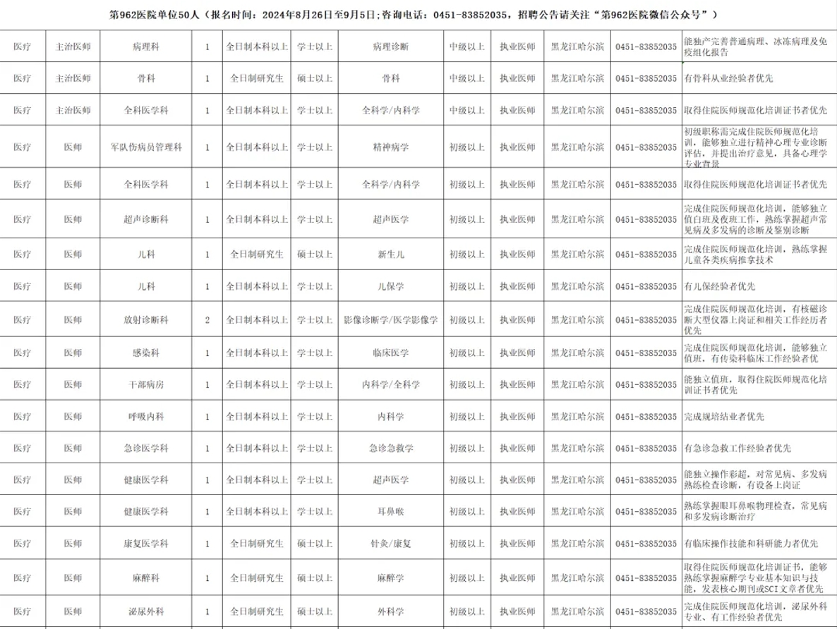 醫(yī)療招聘進(jìn)行時!各地紛紛發(fā)布醫(yī)療招聘公告,廣納賢才,醫(yī)學(xué)教育網(wǎng)為了更好的服務(wù)有就業(yè)意愿的相關(guān)醫(yī)療人員,將會為大家整理并更新各地醫(yī)療招聘的相關(guān)公告,大家可持續(xù)關(guān)注!以下是公告“聯(lián)勤保障部隊第九六二醫(yī)院面向社會招聘醫(yī)療、醫(yī)技、護(hù)理、藥學(xué)及后勤等崗位共50人”的相關(guān)內(nèi)容: